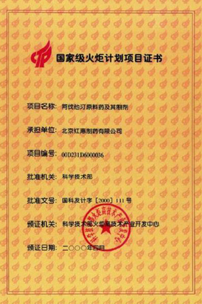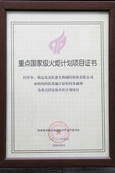 • 阿托伐他汀原料及制劑被列入國家火炬計劃