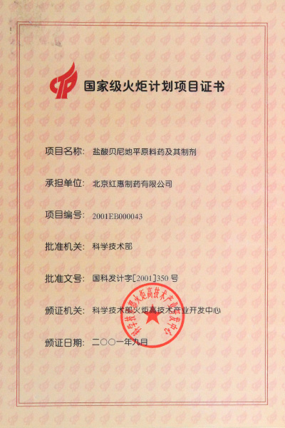 • “鹽酸貝尼地平原料及制劑”被列入國家火炬計劃項目