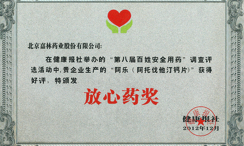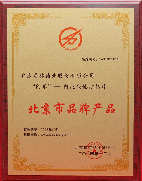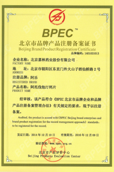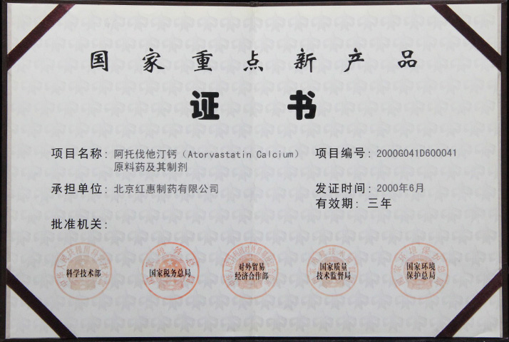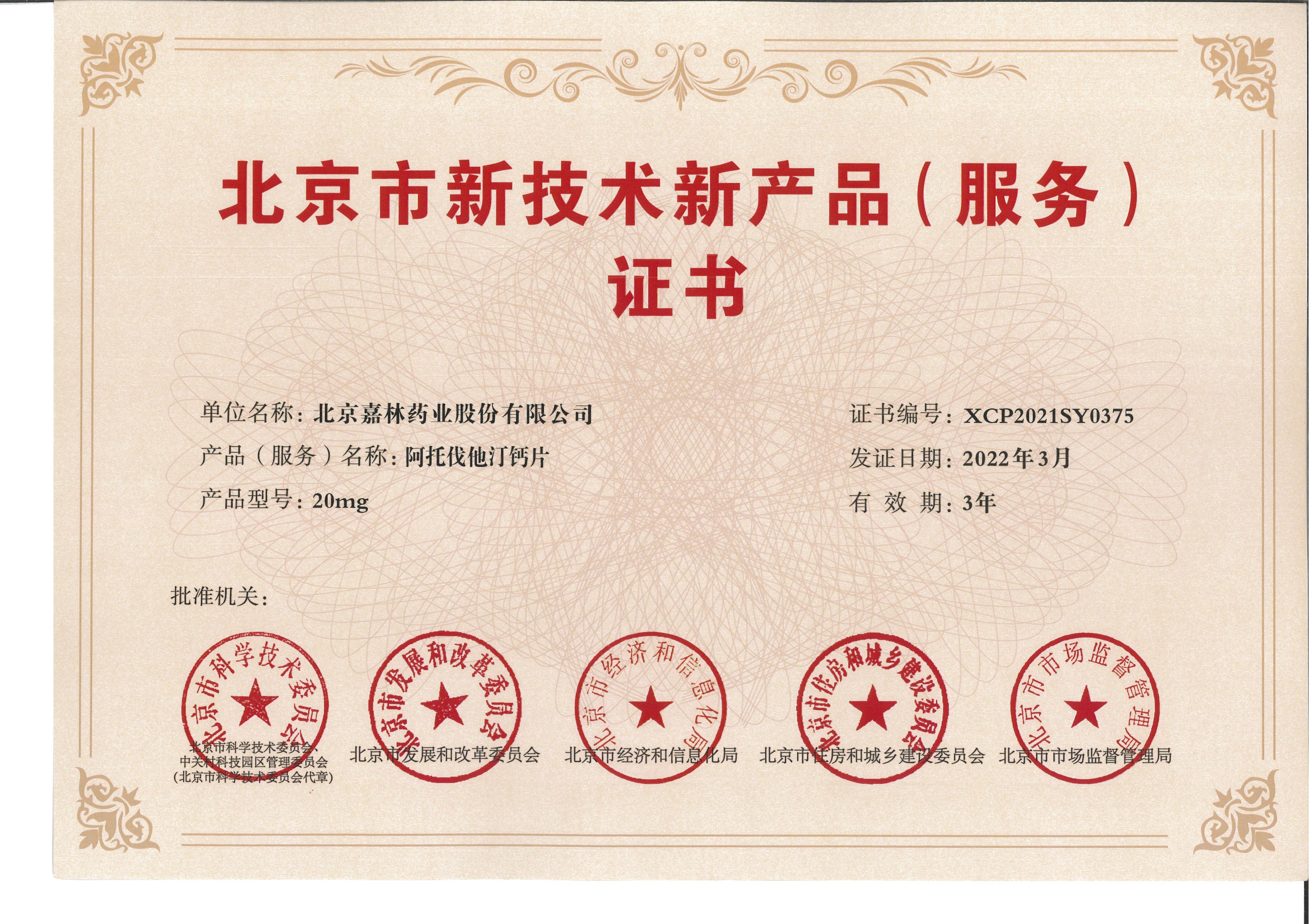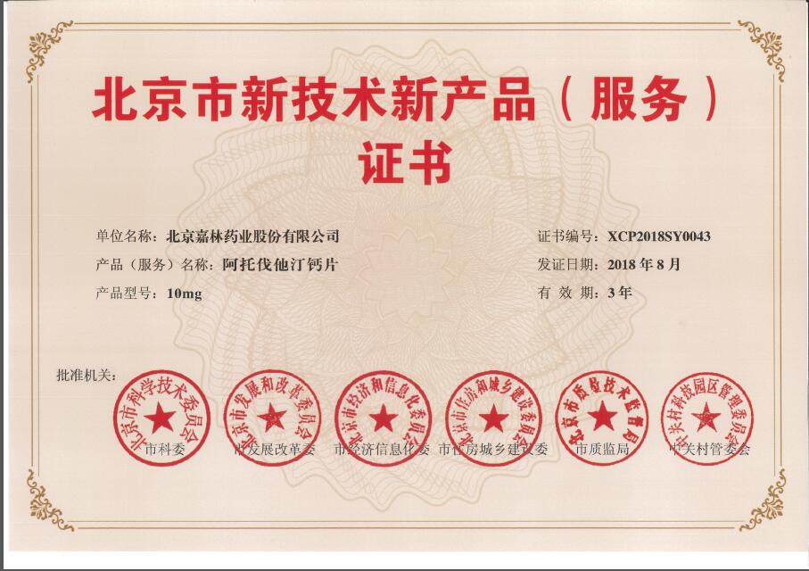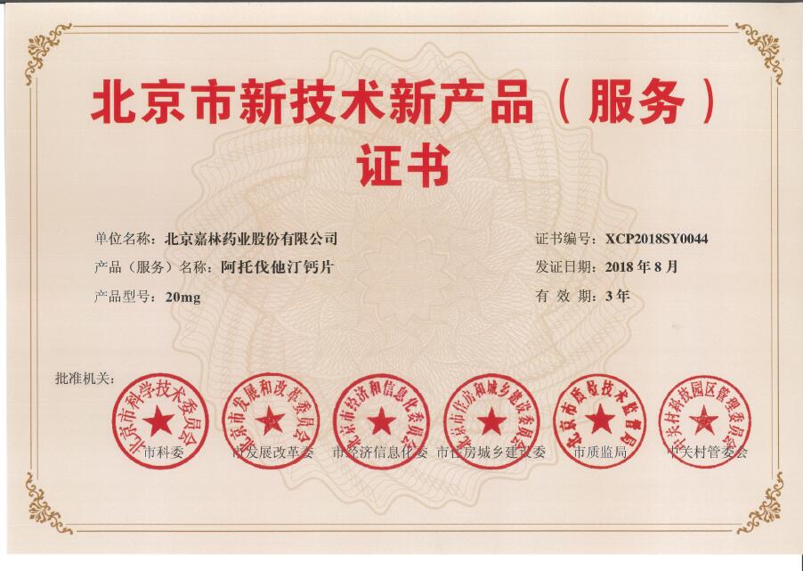 • 阿托伐他汀鈣片20mg榮獲北京市新技術(shù)新產(chǎn)品(服務(wù))證書