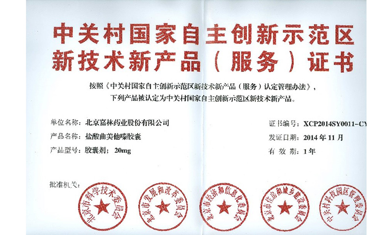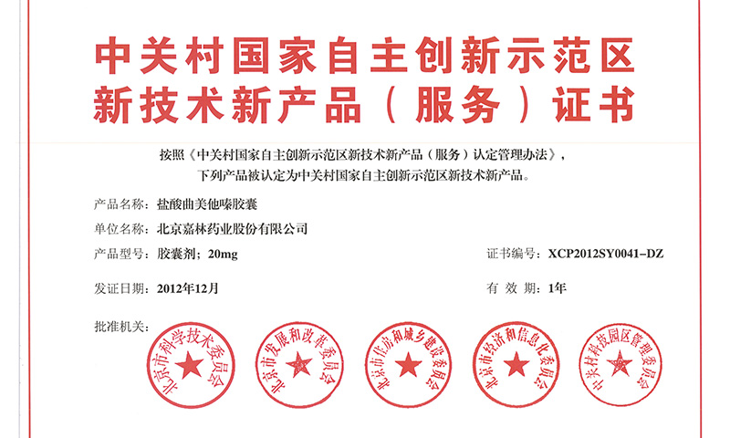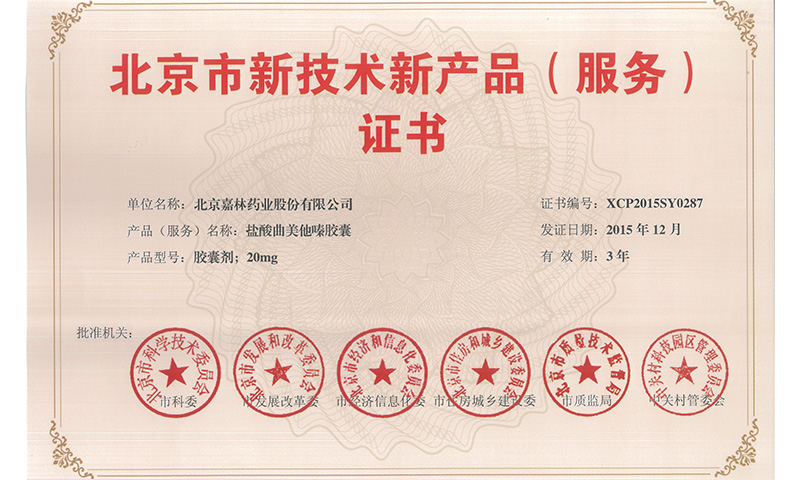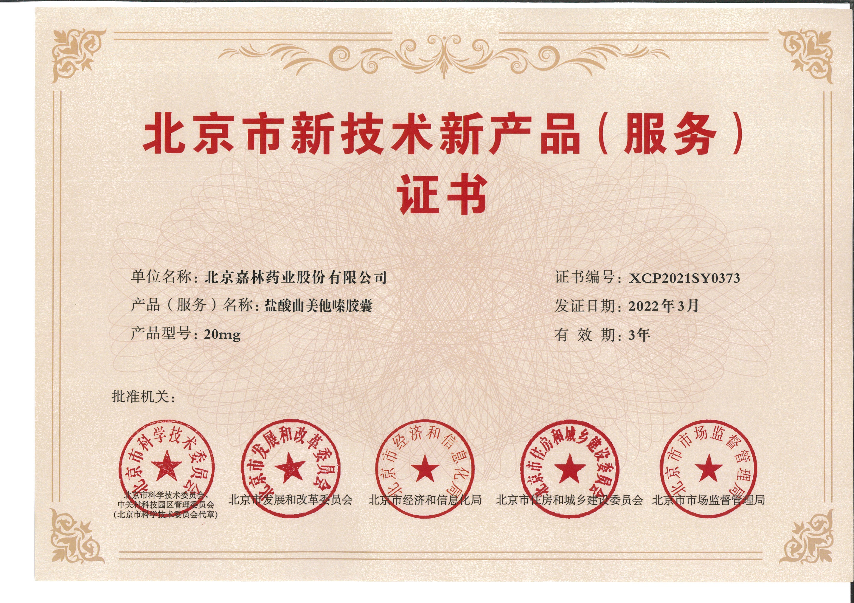 • 鹽酸曲美他嗪膠囊20mg榮獲北京市新技術(shù)新產(chǎn)品(服務(wù))證書