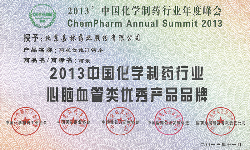 • 阿樂(阿托伐他汀鈣片)榮獲“2013優(yōu)秀產(chǎn)品品牌”稱號