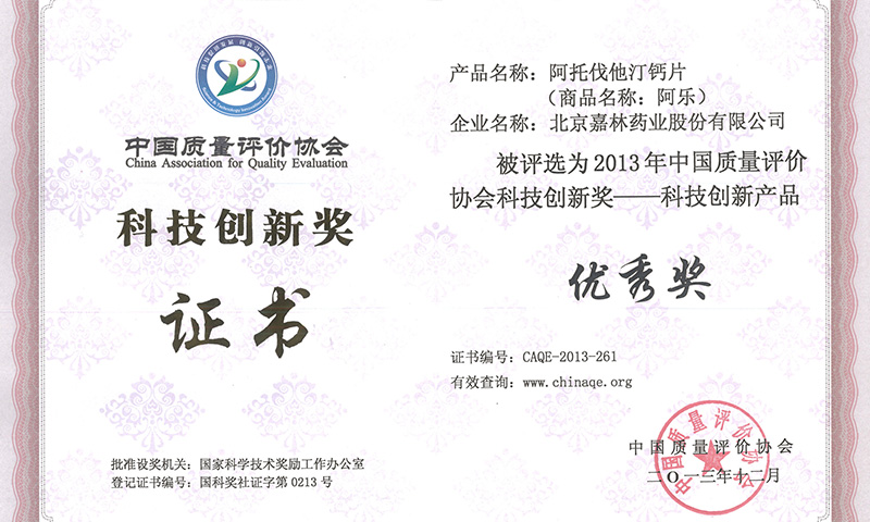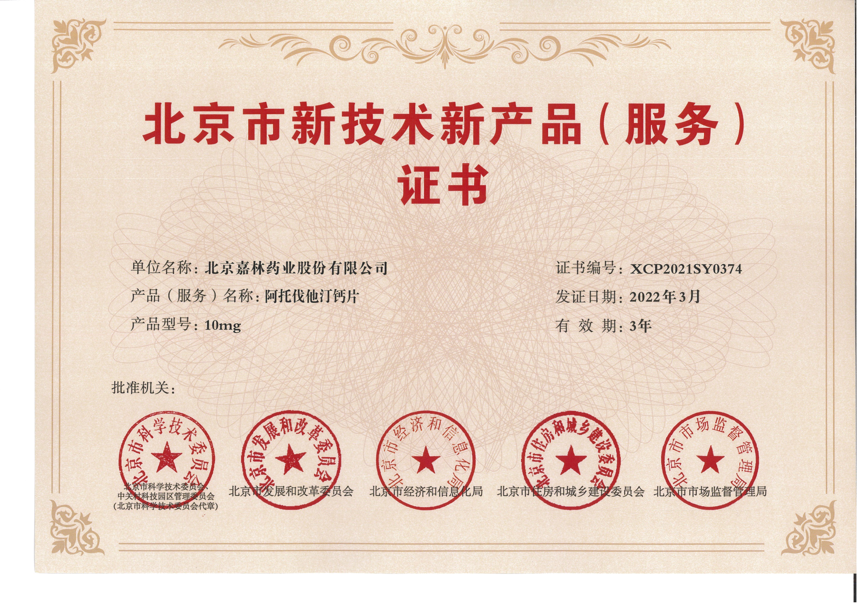• 阿托伐他汀鈣片10mg榮獲北京市新技術(shù)新產(chǎn)品(服務(wù))證書