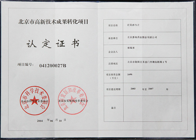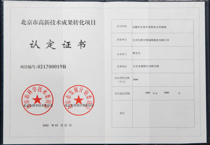 • “鹽酸貝尼地平原料及制劑”通過北京市重大高新技術(shù)成果認定