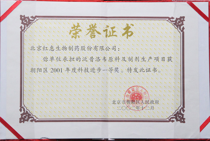 • 泛昔洛韋原料藥及制劑獲北京市朝陽區(qū)2001年度科技進步一等獎