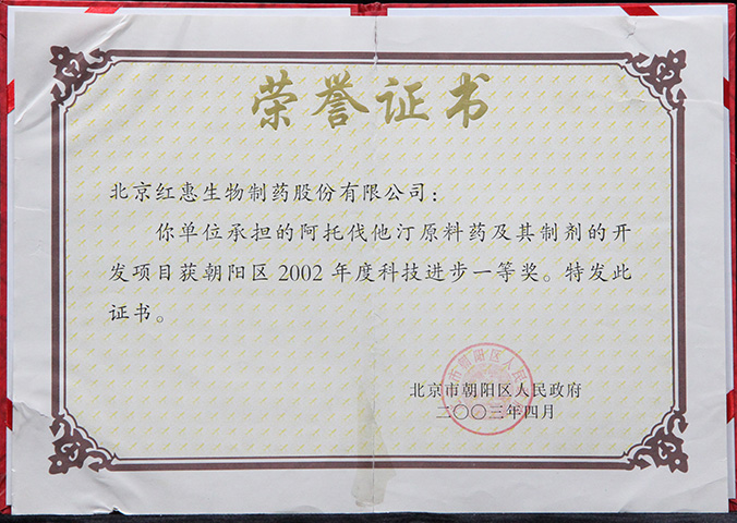 • 阿托伐他汀原料及制劑獲北京市朝陽區(qū)2002年度科技進步一等獎