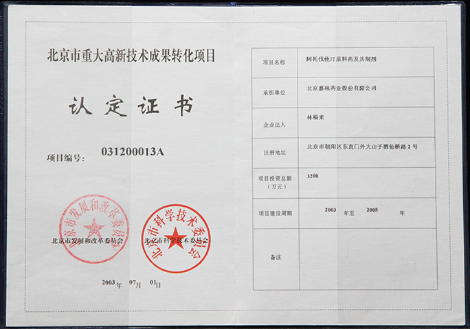 • “阿托伐他汀原料及制劑”通過北京市重大高新技術(shù)成果認定