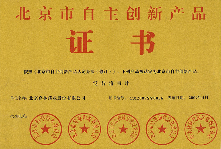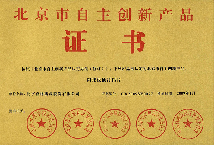 • 阿托伐他汀鈣片被認定為北京市自主創(chuàng)新產(chǎn)品證書